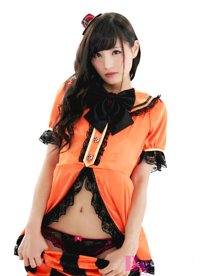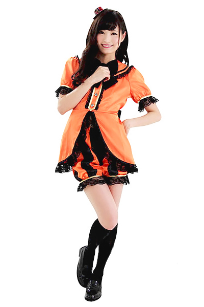 かぼちゃパンツが超キュート!パンプキンカラーのオレンジとセクシーなブラックカラーをあわせてフェミニンに仕上げたこのコスチュームは、ふんわりとしたバルーン袖やトップスの切り込みデザインが特徴的☆レース使いも繊細で、胸元の大きめリボンもとってもラブリー!ゆるめパンツを脱げばヘソチラも出来ちゃう女の子らしいコスチュームになっています♪サイズ:Mサイズ (B78-88、W58-70、H87-95) セット内容:トップス、パンツ、リボン
