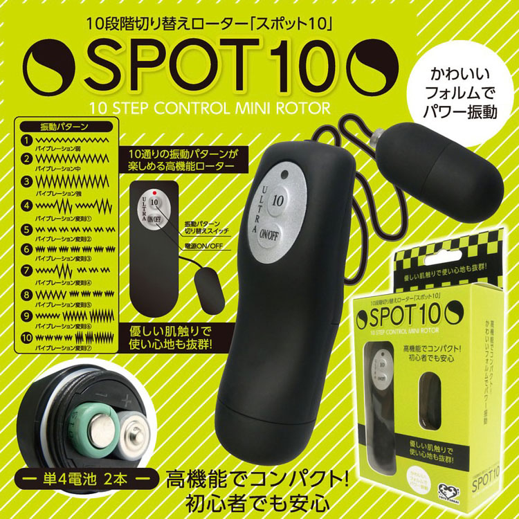10パターンの振動で楽しむ悦びを!コンパクトで使い心地抜群のマイクロローター「SPOT10(スポットテン)」!マットな質感で肌触りが良く、とってもパワフルです。10種類のパターン振動が可能で長く楽しめます。オンオフの切替ボタンとパターン振動を切り替えるボタンの2つだけの簡単操作で初心者の方も安心してお使え頂けます。オーソドックスだからこそ安定・安心して使える、そんなローターとなっています。本体サイズ:ローター3.3×Φ1.7cmパッケージサイズ:15.7×8.9×3.9cm重量:60g