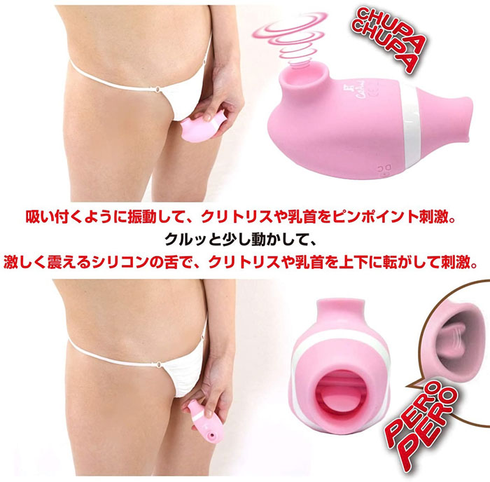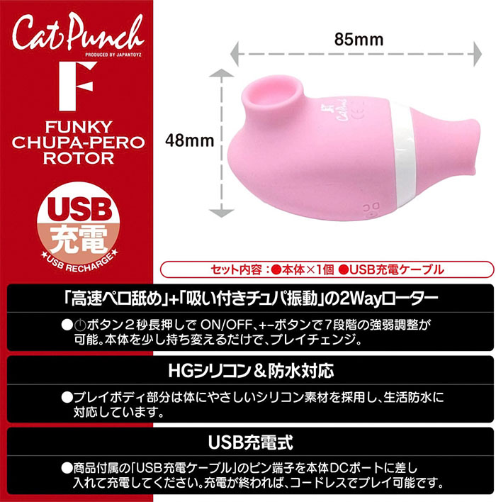 2種類の異なった刺激を楽しめるローターがコンパクトなボディに合体したツイン振動!「高速ベロ舐め」ローターは掘り起こすように高速ベロベロ攻撃!敏感な突起を舌先で転がすように「シリコンのベロ」が上下に高速振動。「吸い付きチュパ振動」ローターは吸い付くクチビルがブルブル振動攻撃!敏感な突起に吸い付きながら振動!かわいい「タコくち」が、ついばむように高速刺激。体に優しいシリコン素材を採用し、生活防水に対応しています。全長:8.5cm吸引口内径:1.5cm電池:USB充電