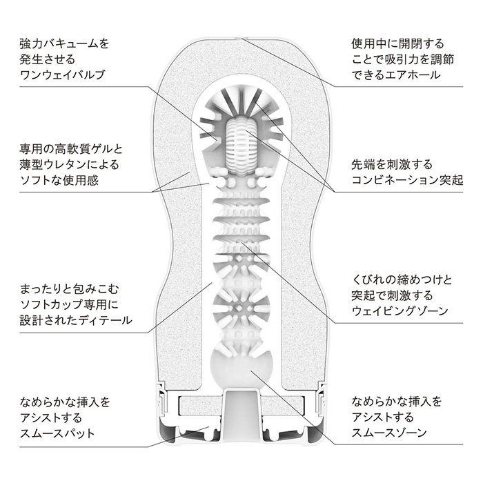 「テンガ オリジナルバキューム・カップ ソフト」 まったりと絡みつく超ソフト設計。くびれ効果で、DEEPな吸いつき感。特殊なバルブ構造によって、エアホールをふさぎながら引き抜くと、内部が真空状態に近づき、驚異のバキューム効果が発生します。まったりと絡みつく超ソフト設計によって、しっとり包みこまれながら、締めつけられる快感をお楽しみください。