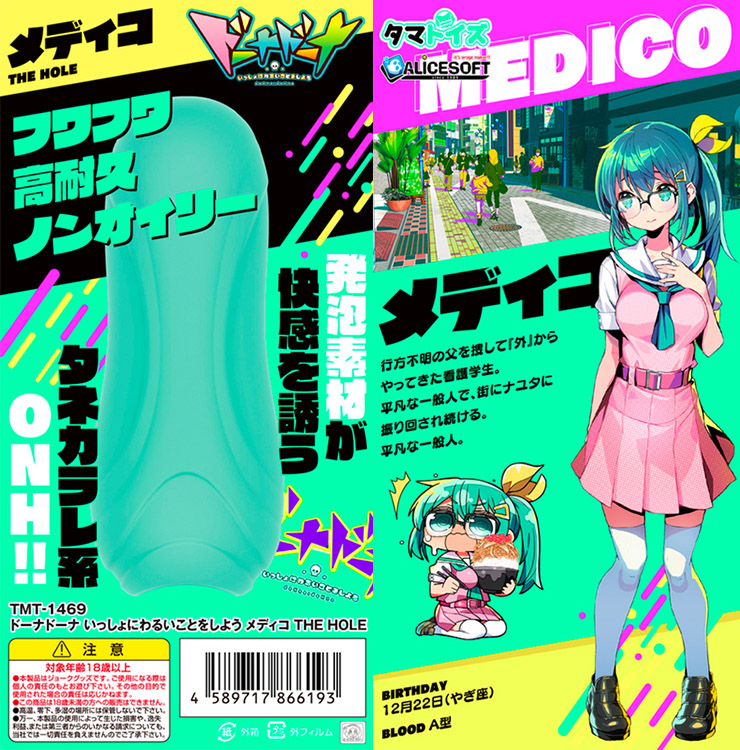 アリスソフトとタマトイズがコラボした、「ドーナドーナ」のオナホールが登場しました。エロゲのヒット作を連発させるアリスソフトと、パロディから匂い系まで責めに責めまくるタマトイズとの強力タッグにより実現したオナホールです。こちらのメディコは、行方不明の父を捜して「外」からやってきた看護学生。平凡な一般人で、街にナユタに振り回され続ける。平凡な一般人。という設定です。新開発の発泡ウレタン素材を採用し、フワフワとした感触で、高耐久、ノンオイリーに優れています。ドーナドーナをプレイしている方はもちろん、プレイしたことがない人もドーナドーナの世界観を存分にお楽しみください。
