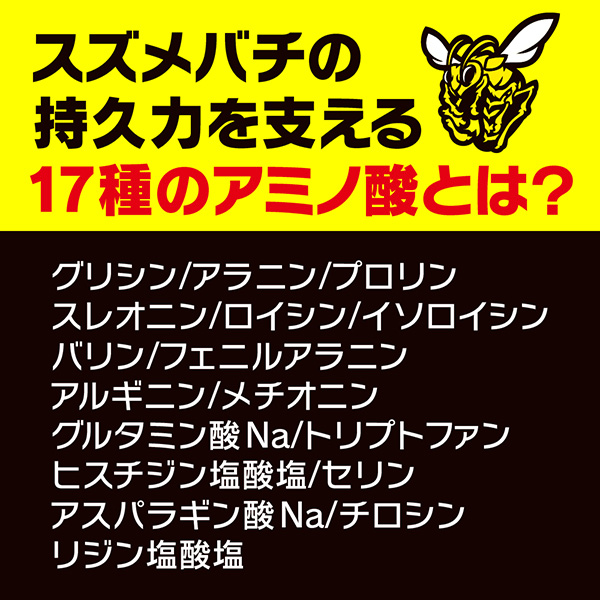 ストロングDVBは、一日に何十kmも移動するスズメバチの持久力を支える17種のアミノ酸をベースに、はちみつ、プロポリス、ローヤルゼリーと、蜂のパワーをふんだんに配合しております。