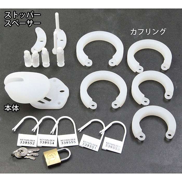 高品質シリコン製貞操帯シリコン製の為柔軟性があり、プラスチックや金属製と比べ比較的負担が少なく日常を過ごす事ができ、排尿や入浴も問題ありません。小さめの方、より拘束感を味わいたい方にオススメのスモールサイズです。セット内容:本体、カフリング×5、リング固定パーツ、スペーサー×4、ストッパー棒×4、南京錠、プラスチックキー×5、日本語説明書本体全長:6.5cm挿入口内径:縦3.3×横3.4cmカフリング内径:3.8、4.0、4.5、4.8、5.0cm