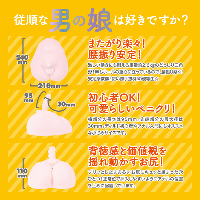 どっしり重量 約2.6kgの据え置き完全固定型 男の娘ホール! 激しい動きにも耐えるどっしり三角形!竿もホールの重心に立っているので、腰振り楽々! 安定感抜群・使い勝手抜群の優等生!初心者OK!可愛らしいペニクリは棒部分の長さが95mm。 先端部分の最大径は30mm。ディルド初心者やアナル入門にもオススメな小さめサイズです。 背徳感と価値観を揺れ動かすお尻は正常位で挿入しやすいようにアナルの位置を上めに配置しています。 男の娘の引き締まった絶品アナルを思う存分ご堪能ください!従順な据え置き男の娘はフローリングやベッドなどにピタッと固定! 挿れて、挿れられ、四方八方どんな方向からの力にも耐えれます。あなたの性癖が目覚めねじ曲がる至極の1本! アソコは好きな形に曲げられる関節骨格内蔵!表面はすべすべ、ふんわりとろける感触。 柔らかいのに骨格内蔵だから可動も自由自在。初めての方も、男の娘好きの方も、ニューハーフ好きの方も全てを満足させる万能ペニクリ。 耐久性抜群の大臀筋を揉み放題!もう戻れない...戻らないっ!!超リアル構造で特大ギミックいっぱいのはっきり刺激! ぐわんぐわんウネル絶品ケツマンコ体験!2連特大イボのパーフェクトウェーブにグニグニ巨大壁の弾力プレス! 極め付けにはキュッと締まった吸引フィニッシュスポット!まさにお尻絶頂新世界!あなたのサイズに合わせて変化する形状記憶素材! プリプリの本素材は伸縮性が高く、様々なサイズに対応します。使うたびにあなたの形状に変化し、毎回違った締め付け刺激を体感できます。 直接肌に触れるものだから、安全性と感触にこだわった高品質なエラストマーを使用しています。保管に便利な専用収納ケース付き。