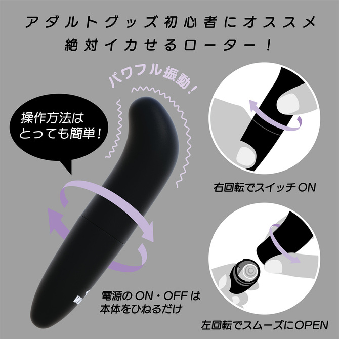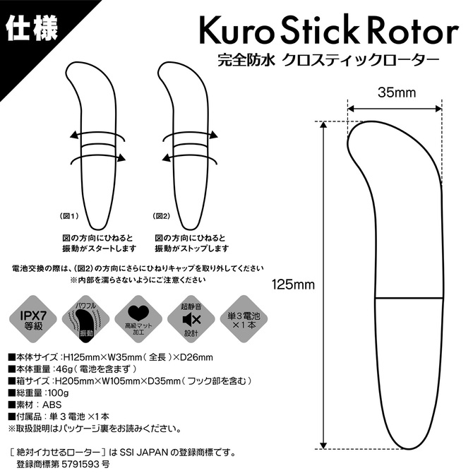 初心者さんにもオススメ!ヒネるだけで楽しめるスティックローターが完全防水(IPX7)で再登場!きゅっとヒネるだけで動き出す快感バイブレーション。片手で持てて、操作もお値段もお手軽なスティックローターが、待望の完全防水(IPX7)になりました。水やローションが気にならず、もちろん丸洗いもOK!電池はたった1本の超軽量! 交換時も軽く回すだけです。【振動機能/単三電池×1本(付属)】カラー:ブラックパッケージサイズ:14×8.5×1.7cm内容量:8ml付属品:単三電池×1本