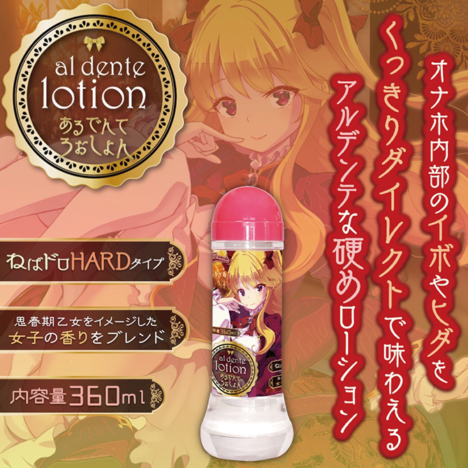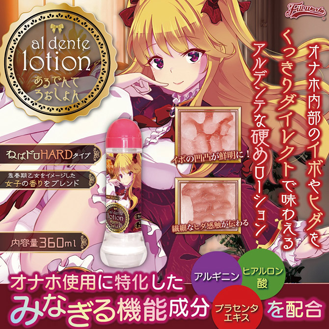 ねばドロHARDタイプ「あるでんて ろーしょん」はオナホ内部をくっきりダイレクトに味わえる「アルデンテ」な硬めローション。イボの凹凸が鮮明になり、繊細なヒダ感触もしっかり分かる「硬め粘度」で配合しました。成分には「アルギニン・ヒアルロン酸・プラセンタエキス」を調合。みなぎる機能成分でオナホ使用に最適なローションとなっています。内容量:360ml