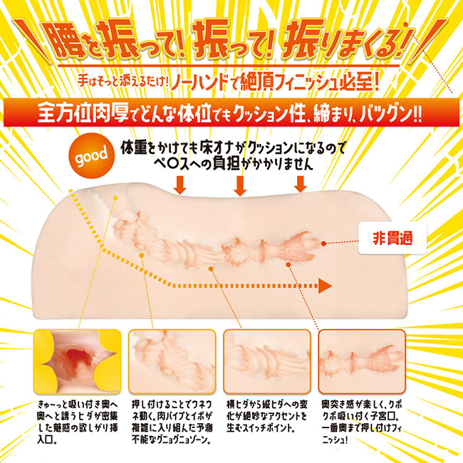 床に向かって腰を振る!人間が一番自然な体勢でプレイできる床オナ専用オナホールです。重量1500gの本体は床にどっしりと根を張るので、激しいストロークでも動かず快適な腰振りが楽しめます♪底面にもしっかり樹脂を割いているのでクッション性も抜群☆体重をかけて上下から挟む形でも負担がかかりません。どんな姿勢で楽しむかは貴方次第。正常位からアクロバティックな体位まで、様々な体勢で絶頂体験!【非貫通/ローション付】パッケージサイズ:H23.5×W24.5×W8.5cm全長:20cm 最大幅:18.5cm