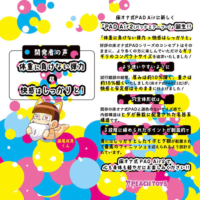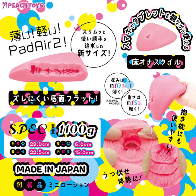 床オナ式PAD Airに新しく「PAD Air 2(パッドエアーツー)」誕生!!厚みは約10%薄く、重さは約15%軽くいたしました(床オナ式PAD21比)が、快感と安定感はそのままに仕上げました☆穴全体形状は、既存の床オナ式PADと遜色のないサイズ感で、内部構造はヒダが無数に配置された名器系構造です。パッケージサイズ:H30×W34×D9cm本体サイズ;H23.0×W22.5×D6.0cm(内部長15.0cm)重量:1100g