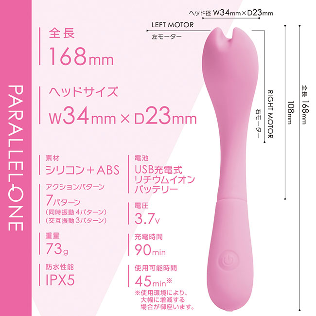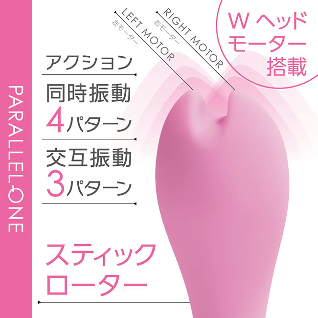 先端に並列で2つのモーターを搭載して、個別に振動させる事が出来るツインモータースティックです。 かわいくてファンシーなピンク色♪ 滑らかな肌心地のシリコン素材と振動の質にこだわったモーターを2機搭載。 プレジャースポットに合わせた角度と日本人に合ったサイズ感が特徴です。 先端は挟んで刺激も出来るように溝を付けています。 先端振動は同時振動・個別振動合わせて7パターン。 90分充電で最大45分使用可能なパワフルなリチウムイオンバッテリーを搭載。(※使用環境により大幅に増減します) IPX5の高レベル防水でしっかり洗えて衛生的です。スマートに振動を楽しめるWモーターヘッドスティックです。