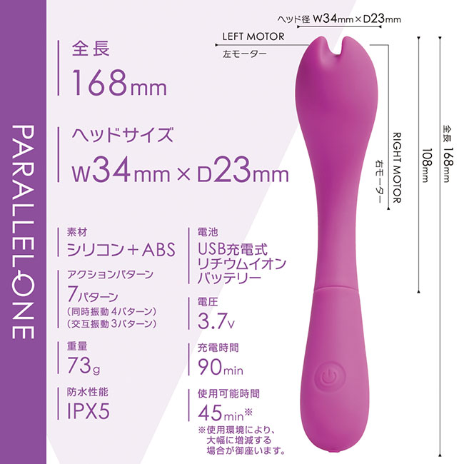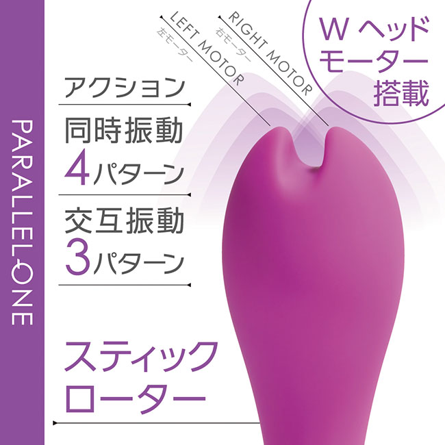 先端に並列で2つのモーターを搭載して、個別に振動させる事が出来るツインモータースティックです。 かわいくて上質なパープル色♪ 滑らかな肌心地のシリコン素材と振動の質にこだわったモーターを2機搭載。 プレジャースポットに合わせた角度と日本人に合ったサイズ感が特徴です。 先端は挟んで刺激も出来るように溝を付けています。 先端振動は同時振動・個別振動合わせて7パターン。 90分充電で最大45分使用可能なパワフルなリチウムイオンバッテリーを搭載。(※使用環境により大幅に増減します) IPX5の高レベル防水でしっかり洗えて衛生的です。スマートに振動を楽しめるWモーターヘッドスティックです。