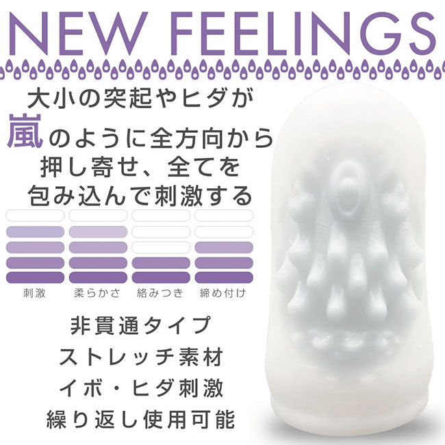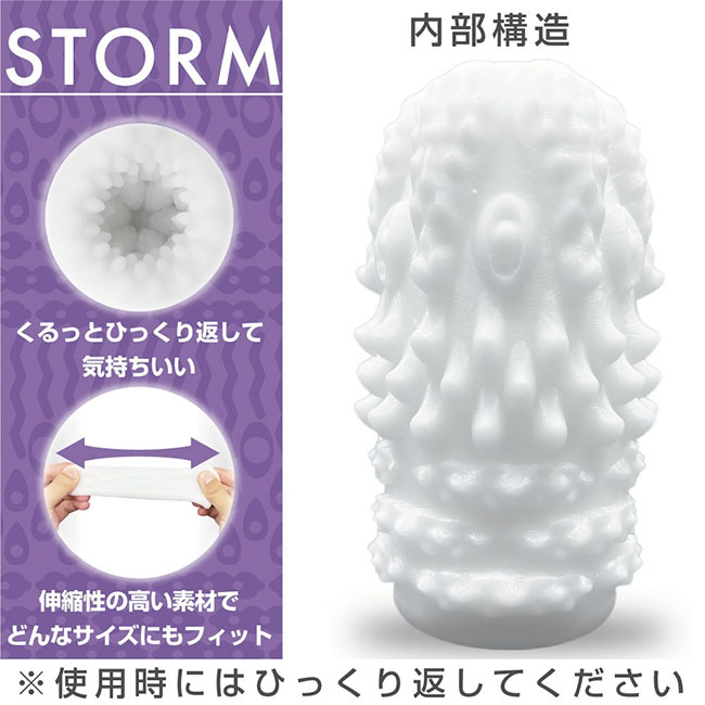 コンパクトでも実用的で繰り返し使えるミニホール。全方向からせり上がるイボが嵐の様に刺激。コンパクトで持ち歩きに便利なミニホール。STORMは360度全方向から斜めにせりだしたイボが怒涛の刺激を生み出します。また最奥は大きな突起を配置し、先端にグリグリひっかかる快感を楽しめます。さらに耐久性も高く、繰り返し使用可能。パッケージサイズ:10.0×5.5cm全長:90mm 直径:5.0cm 重量:55gタイプ:非貫通付属品:ローション付