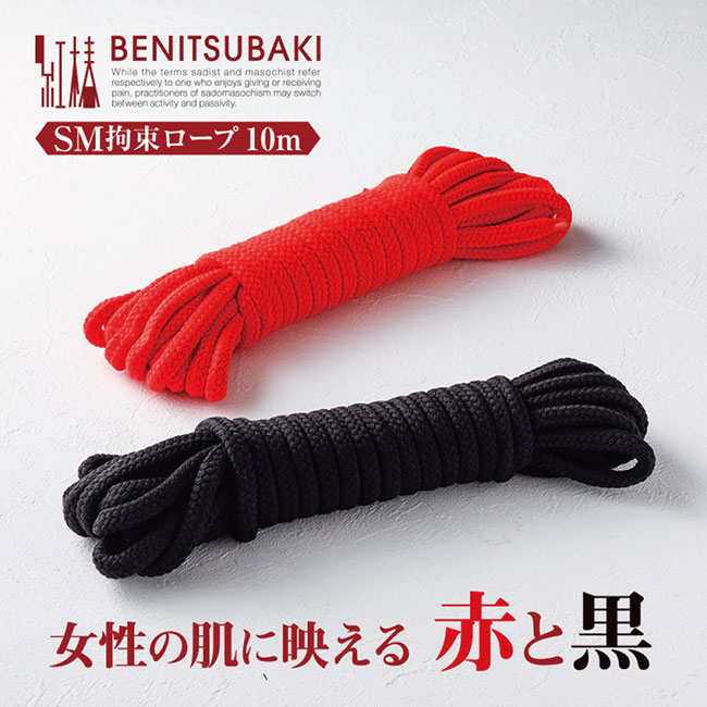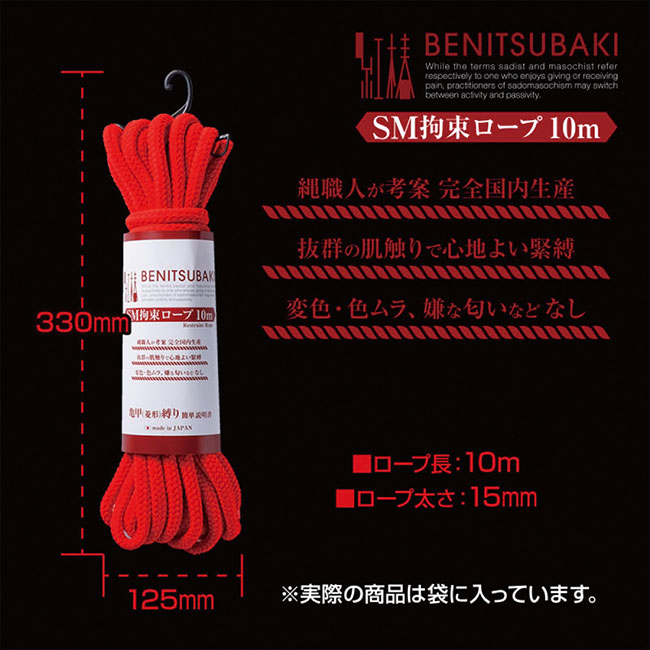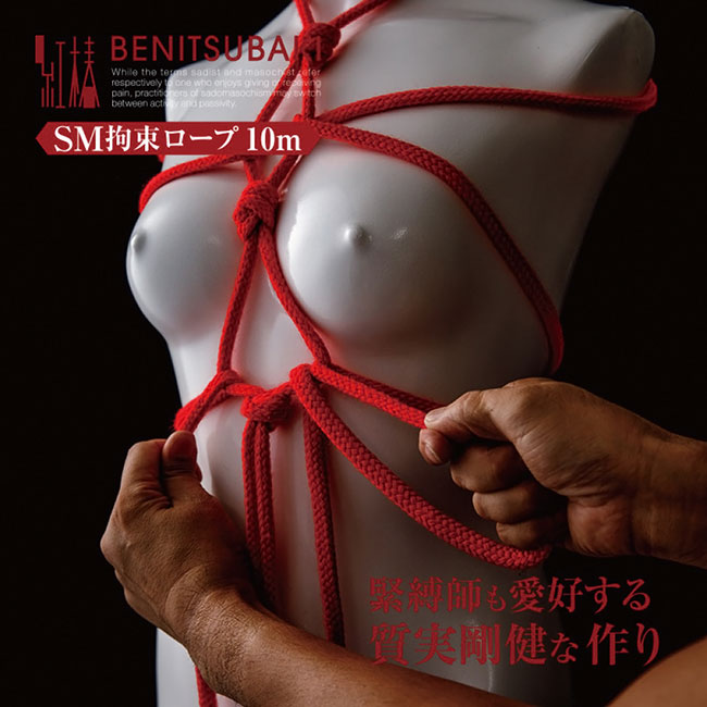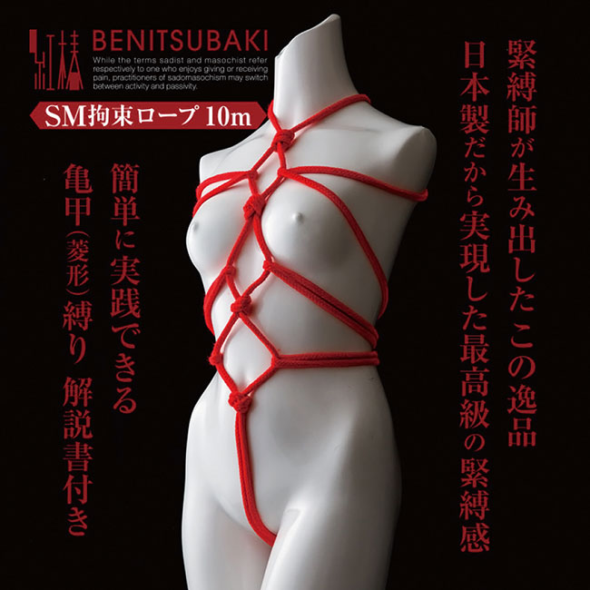 知る人ぞ知る伝説のSM女王・紅椿。このSM拘束ロープは簡単、かつ安全に拘束プレイが楽しめるロープです。程よい柔らかさと弾力感があり、しっかりと肌に馴染む様にできています。この商品には誰でも簡単に亀甲(菱形)縛りができる説明書が付いています。初心者の方でも気軽に本格的な緊縛が楽しめるでしょう。パッケージサイズ:H33.0×W12.5×D5.6cmロープ全長:10m ロープ太さ:1.5cm