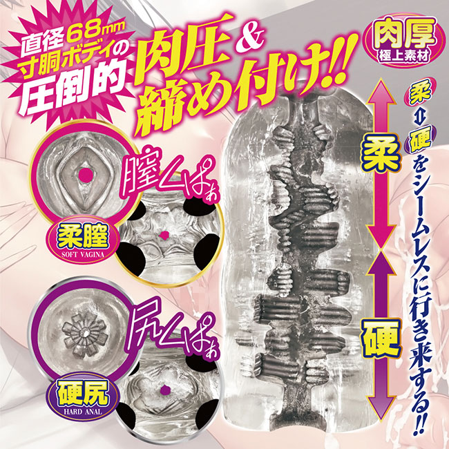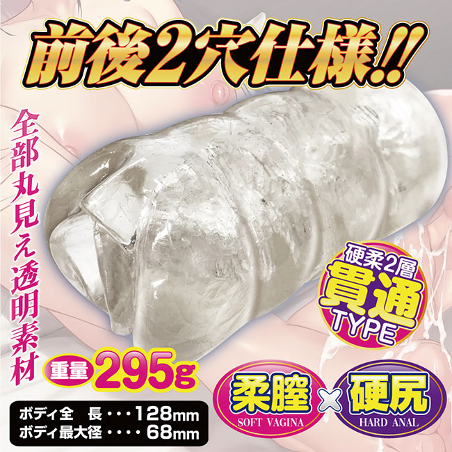 肉厚透明素材がググっと締め付ける! ソフト素材とハード素材のシームレス貫通ホール。 中まですけすけのクリア素材を採用した丸見え貫通ホール。 膣側の入口はソフト素材、お尻側の入口はハード素材を使用し、 シームレスな硬さの変化を楽しめます。