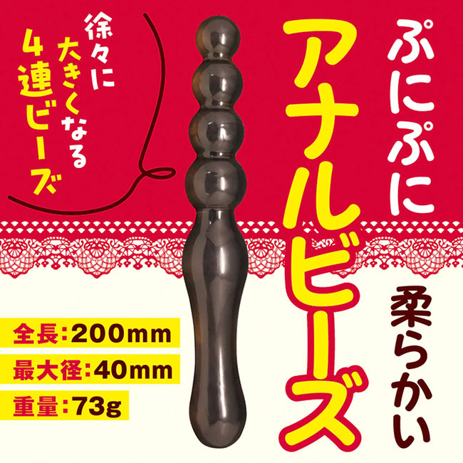 ぷにぷに柔らかいアナルビーズです★ゼリーのように滑らかで、初心者に優しい柔らかさ素材。徐々に大きくなる4連ビーズ部分は、全方向にグニグニ曲がって使いやすい♪商品サイズ:全長20cm×最大径3cm重量:73gパッケージサイズ:21×6×5cm