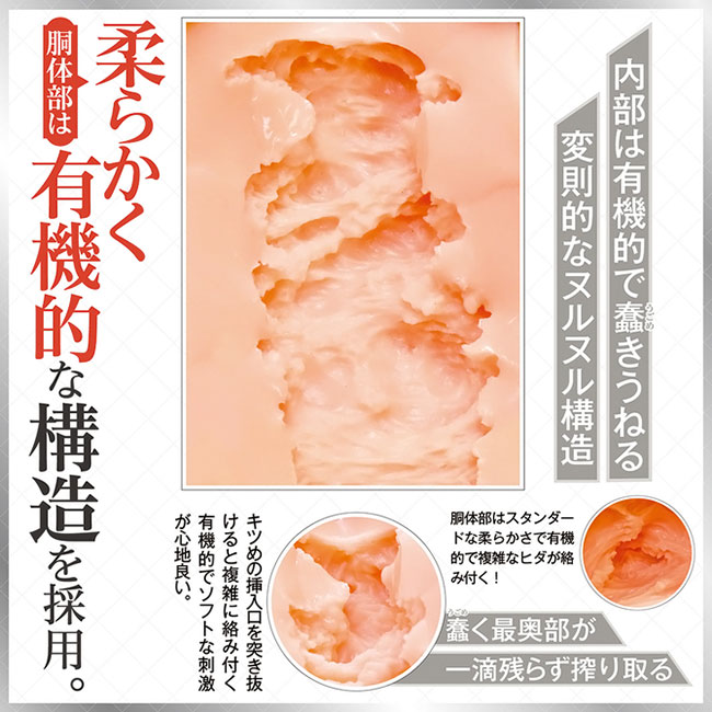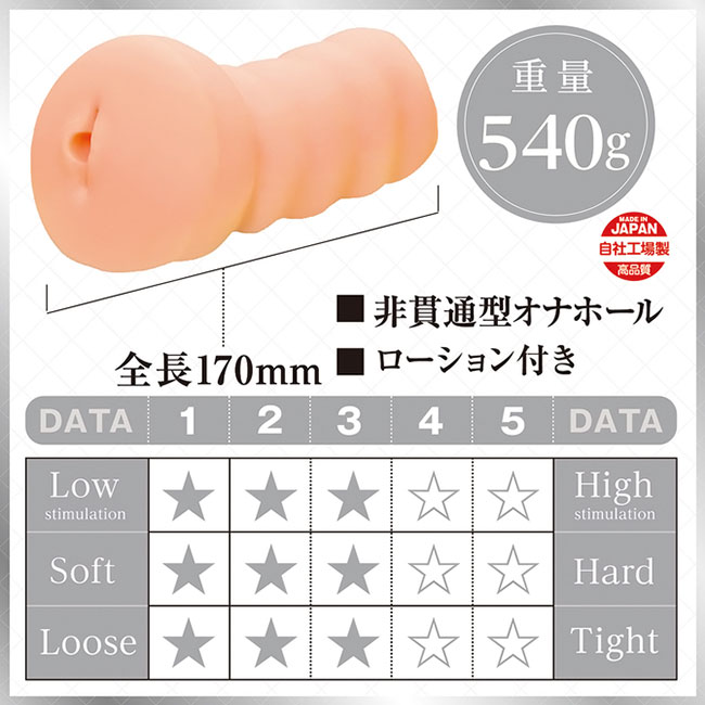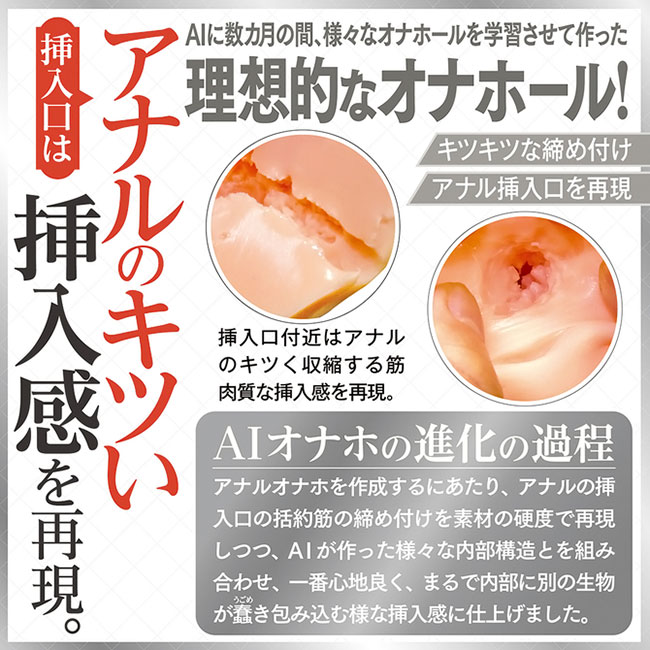 AIに数カ月の間、様々なオナホールを学習させて作った理想的なオナホール!様々なオナホの内部構造をAIに学習させた結果、生成された「アナル」構造です。・挿入口はアナルのキツい挿入感を再現・胴体部は柔らかく有機的な構造を採用・高弾力&高伸縮素材※裏返しにすると破損の恐れがあります。本体サイズ:全長17cmパッケージサイズ:21×14.5×8.5cm重量:540g付属品:ローション日本製