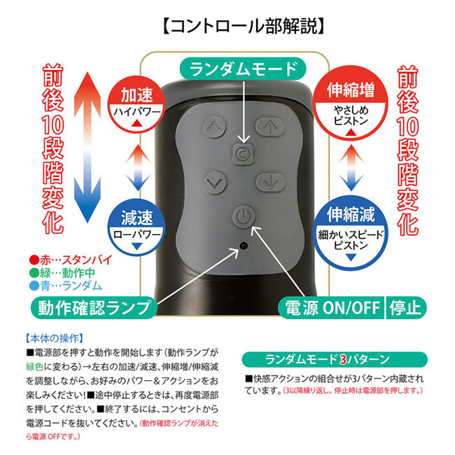 この「リゾア・セックスマシーン for Men」は 激快感オナニーに、また男性トレーニングに最高な パワフルなハンディ型ピストンマシーンです。 持ちやすい軽量ボディにディルドを装着し、 簡単なスイッチ操作で、癒しから絶頂までの 様々なピストン運動をお楽しみいただけます。 従来型の速度・パワー変化だけでなく、繊細な「伸縮操作機能」を追加!! 最奥を責めるロングな伸びピストンや、 高速で挿入口から中ほどを責めるピストンなどなど、 パワー&スピード+テクニックの調整が可能です。 また、驚きのアクションを展開するランダムモード(3パターン)を内蔵。 ※付属のオナホール以外のオナホでもお使いいただけます!